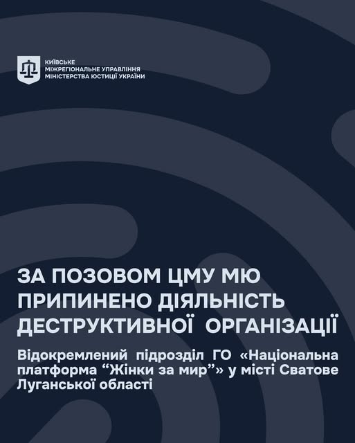 За позовом Центрального міжрегіонального управління Міністерства юстиції (м. Київ) Луганський окружний адміністративний суд 8 липня 2025 року ухвалив рішення про заборону та примусовий розпуск (ліквідацію) Відокремленого підрозділу громадської організації «Національна платформа «Жінки за мир» у м. Сватове Луганської області.