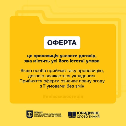 Простими словами: оферта - це готова пропозиція укласти договір. Якщо інша сторона погоджується з її умовами (акцепт), договір вважається укладеним.