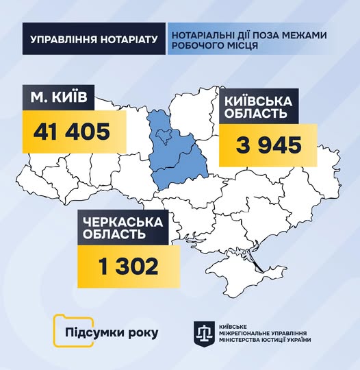 За підсумками 2025 року у регіонах Київського міжрегіонального управління Міністерства юстиції України державні та приватні нотаріуси вчинили 46 652 нотаріальні дії поза межами робочого місця, з них:
