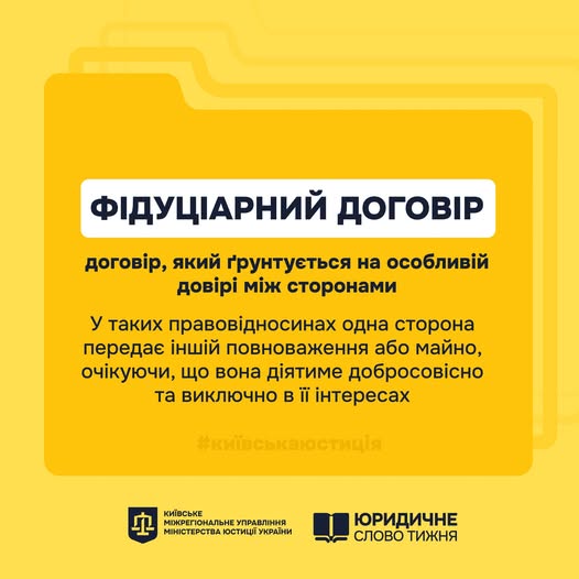 Фідуціарний договір - це договір, який ґрунтується на особливій довірі між сторонами. У таких правовідносинах одна сторона передає іншій повноваження або майно, очікуючи, що вона діятиме добросовісно та виключно в її інтересах.